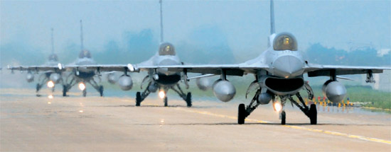圖為韓國空軍KF-16戰(zhàn)斗機降落在第一戰(zhàn)斗飛行團(tuán)跑道上,正前往停機場。