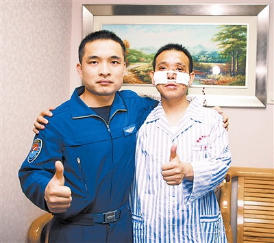 9時(shí)16分,飛機(jī)降落在跑道上,早已等候在停機(jī)坪上的官兵沖了上去。經(jīng)診斷,張建興面部裂傷7處,頭、面部大面積挫傷,傷口最長(zhǎng)達(dá)6厘米,深達(dá)顴骨,并有骨質(zhì)暴露,面部需縫合30余針。