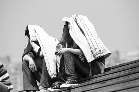 昨日鄭州氣溫較高,兩名青年用衣服抵御陽(yáng)光的暴曬。