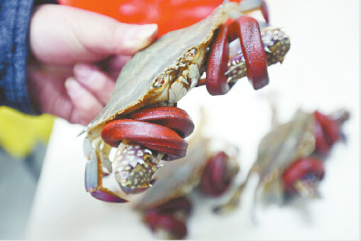 雁鳴湖路邊蟹販“遙控”重量