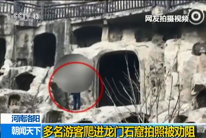 游客爬進(jìn)龍門石窟拍照被勸阻