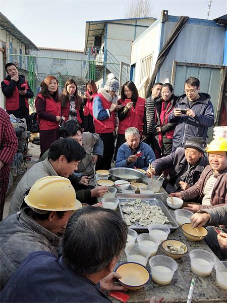 與此同時,第三路名嘴李璇和王澄也在鄭州市北建材附近的工地上行動了起來。他們帶著15名義工來到工地食堂,為民工兄弟們煮起了餃子。餃子出鍋,主持人李璇和王澄和民工兄弟們圍坐在一起,聊著天,品嘗熱騰騰的水餃。在現(xiàn)場,主持人還遇到了一位特殊的老人——劉春娥。劉老太太常年堅持義務給農民工送衣服鞋墊,可以說,鄭州工地上的人都認識這位老太太。今天,劉老太太正巧又給這里的工人們帶了40對新納好的鞋墊兒,前不久,老太太才送來了不少衣物。拿著新鞋墊,吃著熱餃子,民工兄弟們個個笑開了花。