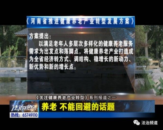 生、老、病、死是自然規(guī)律。而養(yǎng)老,是每個(gè)家庭無(wú)法回避的話題。近日,我省出臺(tái)了關(guān)于養(yǎng)老產(chǎn)業(yè)發(fā)展的新政策。有業(yè)內(nèi)人士稱(chēng),這是惠及老年人以及養(yǎng)老產(chǎn)業(yè)發(fā)展的重大利好消息。那么,這些新政策有什么內(nèi)容,會(huì)帶來(lái)哪些福利?河南省發(fā)展改革委、河南廣播電視臺(tái)法治頻道,聯(lián)合推出了六集系列報(bào)道《關(guān)注健康養(yǎng)老產(chǎn)業(yè)轉(zhuǎn)型》,從今天開(kāi)始,我們將為您逐一介紹。