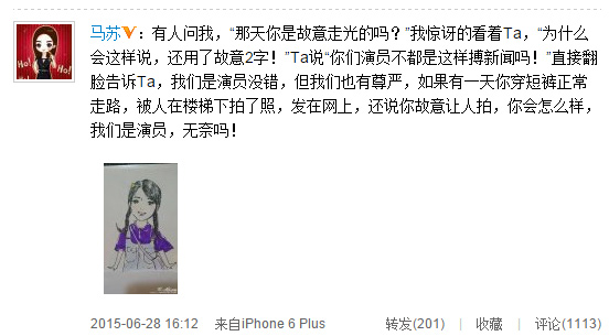 前天(6月26日),演員馬蘇參加某代言活動(dòng),下樓梯時(shí)被媒體拍到,稱其“疑似走光露臀部”。6月28日下午,馬蘇在微博公開回應(yīng)此事,稱“演員也有尊嚴(yán)”。