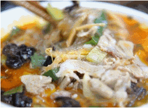 將羊肉和羊骨放入鍋中一起熬制成鮮香的羊湯,將大鍋里熬好的羊湯放入小鍋中,加入木耳粉絲黃花菜蔥花,煮的軟爛的羊肉切成片狀,放入鍋中一起熬制,再放一點(diǎn)羊油辣椒用筷子輕輕一攪,羊湯的香味混著辣椒的焦香,這香味讓人無(wú)法拒絕,相信這地道的登封燴羊肉一定能俘獲韓寒的胃。