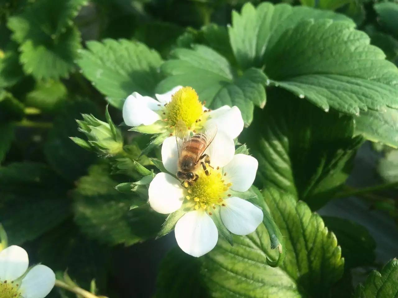 紅顏草莓是由優(yōu)質(zhì)草莓品種章姬和幸香雜交育成,它繼承了章姬的鮮甜和幸香的耐儲(chǔ)存,也因根基部顏色發(fā)紅得名。一進(jìn)棚,就聽(tīng)到陣陣的嗡嗡聲。潔白的草莓花上,小蜜蜂展著透明的翅膀正忙著采蜜。據(jù)說(shuō)經(jīng)過(guò)蜜蜂授粉良好的花朵才能長(zhǎng)出個(gè)頭飽滿勻稱的草莓。