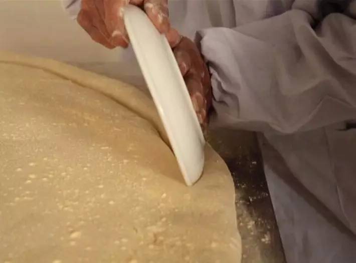 固始生態(tài)環(huán)境優(yōu)良,出產(chǎn)的小麥面粉清香味很足但筋度不夠,搭配上高筋粉和鹽水來和面,而溫度、濕度和水分的比例也很有講究。別看這面盆不起眼,卻已經(jīng)用了七八十年,稱得上是傳家寶了。