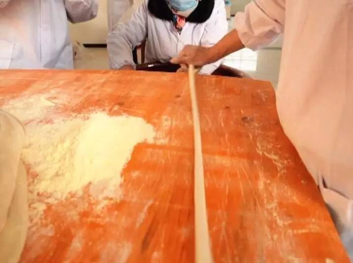 原本二三十厘米長的面條經(jīng)過三次掙面,竟然被拉到一米多長,整個過程沒有一根面斷掉,一根根柔韌潔白,如同細絲一般,讓人嘆為觀止。