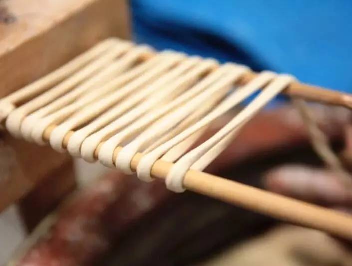 接下來的上面非常考驗眼力和手指的靈活度,搓細的面以八字結繞在木棍上,上下飛舞卻紋絲不亂,看的人眼花繚亂。上好的面條根根粗細均勻間距相同,精致的如同工藝品。
