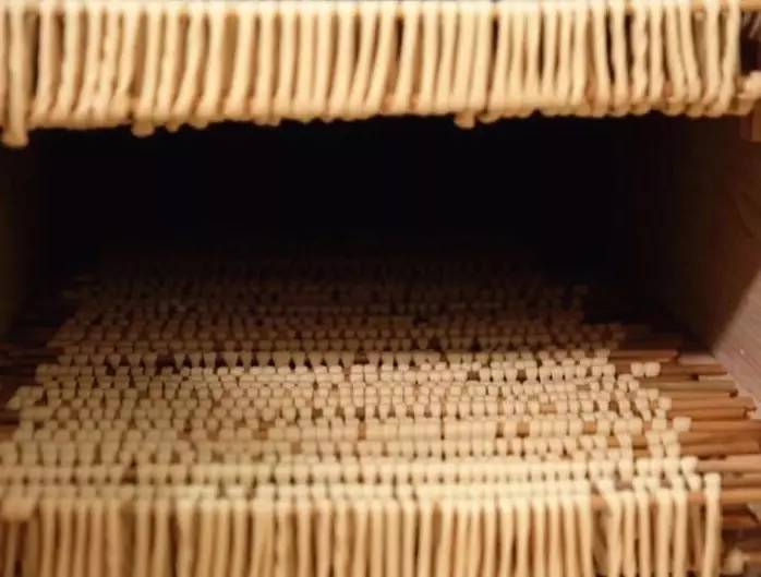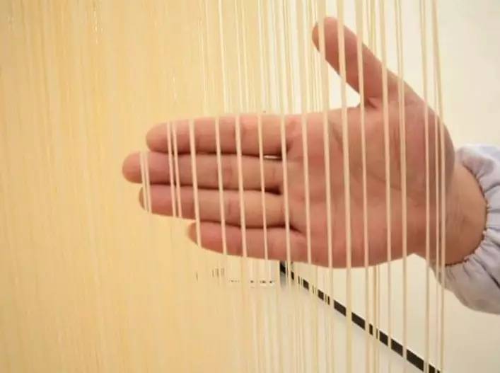 如果以為眼前這潔白如絲的面條就是人主掛面,那你就錯了。面條晾到七八成干時,將底部的木棍拿起反向插到架子上最終成型。這漁網(wǎng)狀絕對是人主掛面最獨特的標志。