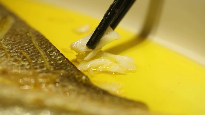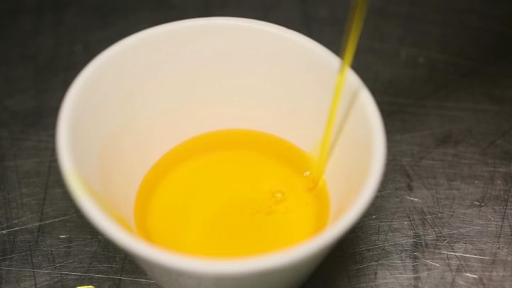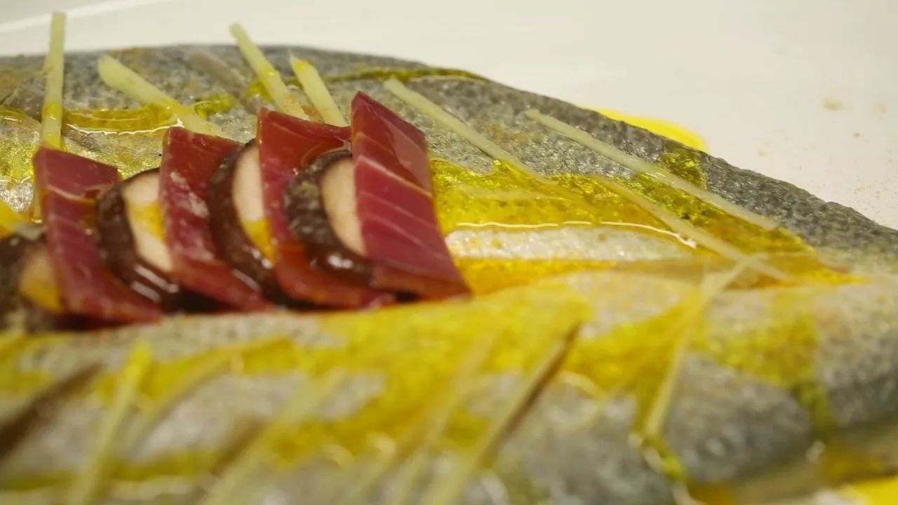 這種黃金油是用南瓜做底,還加入了花椒油等調(diào)料。整體清澈透明,聞起來有一股甜甜的香味,均勻澆在大黃魚身上。上爐蒸制的時候,料油在高溫作用下充分滲透進了魚肉里,不僅可以給魚肉調(diào)味增鮮,還能提升整道菜的顏值。