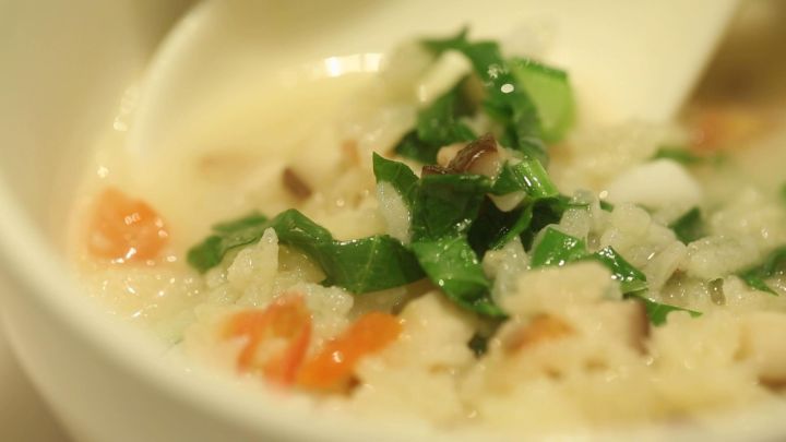 米粒提前炸過,配著蝦仁、香菇、青菜和西紅柿丁,趁熱吃大米還有嘎嘣嘎嘣的脆響,要是不急就再泡上一會兒,米飯吸滿了湯汁就又是另一種軟糯的口感。