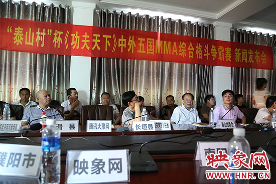 映象網(wǎng)訊(記者 袁野)2016年8月14日上午10點,由新鄭市龍湖鎮(zhèn)泰山村委會冠名主辦、河南電視臺新農(nóng)村頻道與河南登封少林寺塔溝武術(shù)學(xué)校協(xié)辦、《功夫天下》欄目承辦的“泰山村”杯《功夫天下》中外五國MMA綜合格斗冠軍爭霸賽新聞發(fā)布會在泰山村委會黨員活動室召開,來自鄭州的十余家主流媒體代表和來自全省各地市的自媒體代表團(tuán)濟(jì)濟(jì)一堂,共同見證這一盛大賽事的開幕。