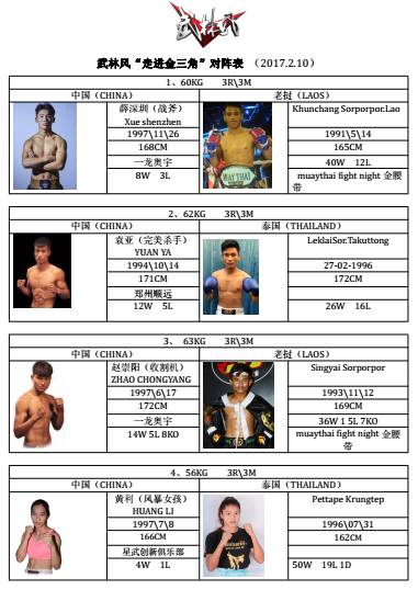 2017年2月10日,武林風應老撾金三角經濟特區(qū)邀請,聯(lián)合WLF世界搏擊理事會運營機構、全球高端訂制賽事運營商,頂級劇場式搏擊賽事運營機構——云頂星戰(zhàn),再次走進這片神秘的土地。當地組織了強大的選手陣容嚴陣以待,包括泰國、老撾、柬埔寨等東南亞各國頂尖高手。