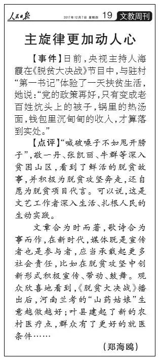 評(píng)論中還指出,文章合為時(shí)而著,歌詩(shī)合為事而作,在新時(shí)代,媒體既是宣傳者也是參與者,應(yīng)當(dāng)承載起更多社會(huì)責(zé)任,比如在脫貧攻堅(jiān)中創(chuàng)新形式積極宣傳、帶動(dòng)、鼓舞。觀眾欣喜地看到,《脫貧大決戰(zhàn)》播出后,河南蘭考的“山藥姑娘”生意越做越好;葉縣建起了新的農(nóng)村醫(yī)療點(diǎn),群眾有了更好的就醫(yī)條件……