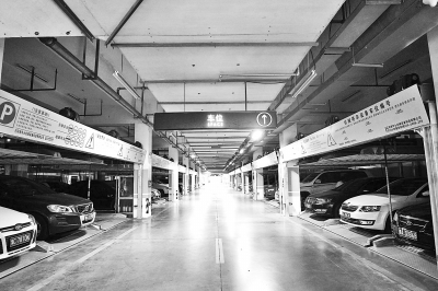 該停車場負(fù)一層是機(jī)械車庫,停得滿滿當(dāng)當(dāng);負(fù)二層也是機(jī)械車庫,但還有空位。