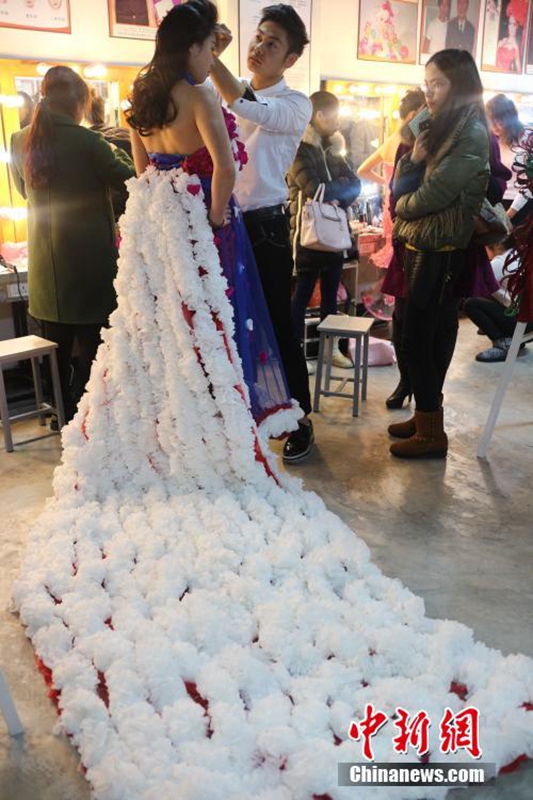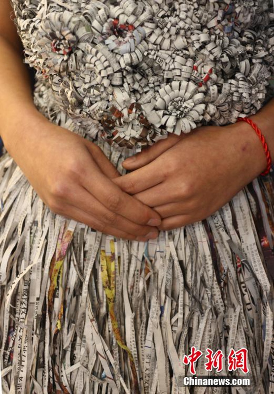 1月12日,成都職業(yè)技術(shù)學(xué)院數(shù)十名大學(xué)生將自己設(shè)計(jì)的期末作品——紙婚紗穿上展示,這些作品都是經(jīng)過數(shù)天時(shí)間手工制作而成,以報(bào)紙、衛(wèi)生紙、成績(jī)單等作為原材料,大學(xué)生在完成個(gè)性化的婚紗定制的同時(shí)還倡行了廢物利用的環(huán)保理念。圖為大學(xué)生穿上自己的紙婚紗作品。 張浪 攝