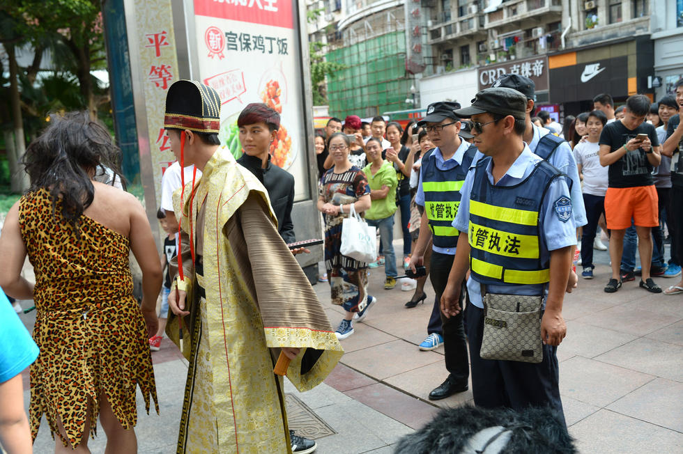 2015年9月13日,湖北武漢江漢路上,6名男青年玩“穿越”情景劇,引起許多好奇的群眾圍觀。由于他們的活動(dòng)事先沒(méi)有辦證,活動(dòng)進(jìn)行5分鐘后,他們就被迅速趕來(lái)的城管執(zhí)法隊(duì)員勸離。