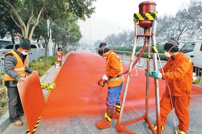 “機動車道6米寬,鋪設‘綠道’的自行車道也為6米寬??磻T了灰黑色的路面,在看到色彩明銳的‘綠道’后肯定覺得眼前一亮?!G道’只是叫法,并不是說道路外觀一定是綠色的,在景觀設計中,‘綠道’往往有著更深更廣的內涵。”工程負責人呂先生告訴記者,彩色瀝青厚度僅為1到2毫米,壽命在5年以上,具有警示、防滑、降噪、美觀等特點?!拔覈G道’通常以警示色紅色為主打,主要作用是打造人車分離模式,供騎車者和步行者休閑使用?!?/p>
