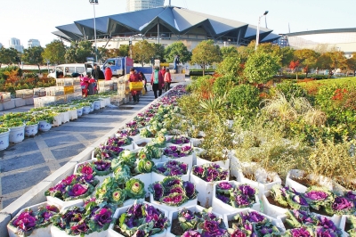 “嘿,快看,真美!感覺好像瞬間穿越到了絢麗多彩的春季!”昨日中午,在鄭東新區(qū)CBD商務內環(huán),幾名市民指著花壇內一大片黃、紅、紫三色相間的鮮花說。在這里,記者看到一撥撥工作人員正忙著將一盆盆鮮花擺放到預先設置好的花架上。姿態(tài)秀逸、枝葉扶蘇,綴滿鮮艷奪目紅果的南天竹十分吸睛;各種色彩亮麗的花朵,則為冬日的鄭州增添了一抹迷人的色彩;株形如牡丹,葉片形態(tài)美觀多變,觀賞性不輸鮮花的甘藍更是隨處可見。